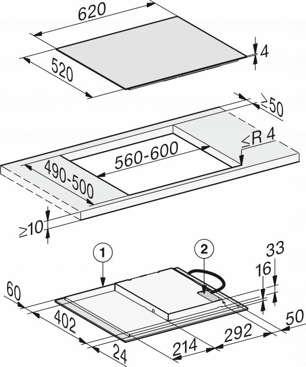 • V šířce 620 mm pro instalaci nad pracovní deskou nebo pro zapuštění
